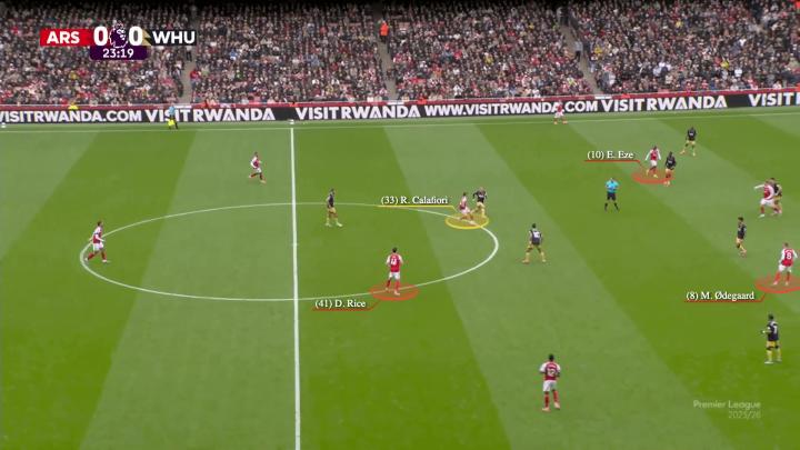 ……但他游弋到右肋區(qū)域,在那里形成人數(shù)優(yōu)勢??ɡ茒W里的移動迫使馬特烏斯-費(fèi)爾南德斯離開對厄德高的盯防,這又使得西漢姆的左中衛(wèi)基爾曼必須保持一個更高的位置來跟防阿森納隊(duì)長。