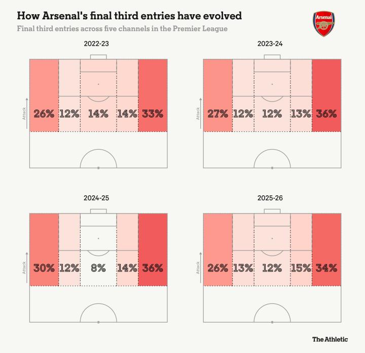 阿森納遵循著同樣的模式,將進(jìn)攻三區(qū)的進(jìn)入點(diǎn)集中在邊路(右路和左路分別占34%和26%),與2024-25賽季相比,中路通道的比例略有上升。