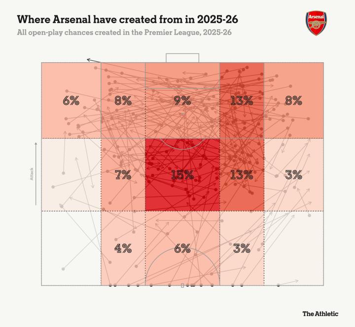 即使在厄德高因傷缺席多場比賽的情況下,阿森納本賽季英超仍有29%的運(yùn)動戰(zhàn)機(jī)會是從這個區(qū)域創(chuàng)造的。