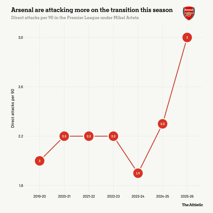 直接進(jìn)攻的定義是:在本方半場開始控球,并在15秒內(nèi)形成射門或進(jìn)入對方禁區(qū)的觸球——換句話說,就是反擊。阿森納本賽季英超場均3次直接進(jìn)攻,是阿爾特塔自2019年12月上任以來的最高值。