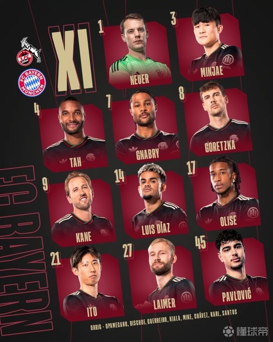 拜仁慕尼黑首發(fā):1-諾伊爾、21-伊藤洋輝、4-約納坦-塔、3-金玟哉、27-萊默爾、8-格雷茨卡、45-亞歷山大-帕夫洛維奇、7-格納布里、14-路易斯-迪亞斯、17-奧利塞、9-哈里-凱恩